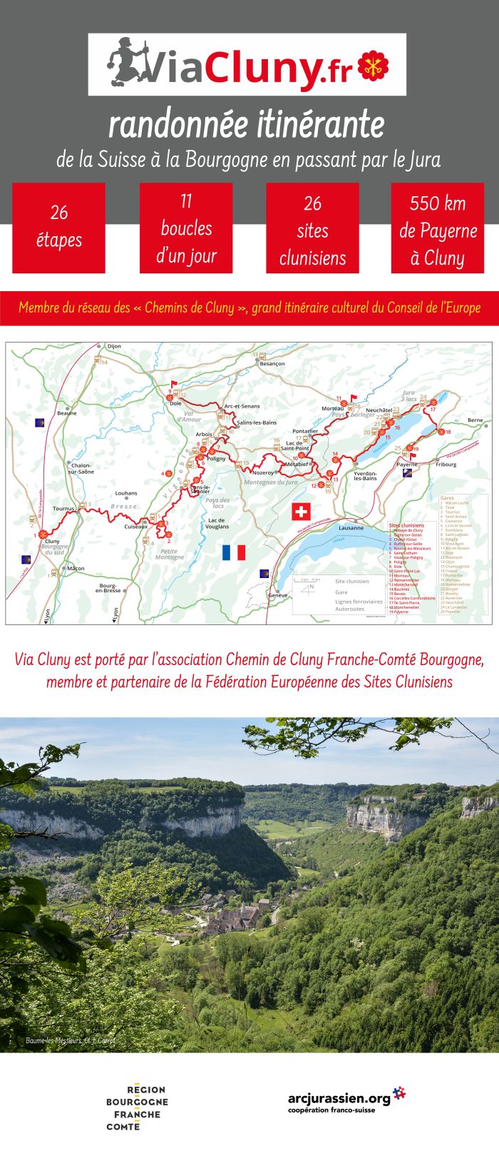 L'association Chemin de Cluny Franche-Comté Bourgogne, porteuse de ViaCluny.fr, est membre du réseau des Chemins de Cluny (Grand Itinéraire Culturel du Conseil de l’Europe). Elle remercie toutes les intercommunalités partenaires dont les Offices de Tourisme, sont nos relais privilégiés, ainsi que l'Arc Jurassien pour leur soutien, tout comme les instances touristiques territoriales : |