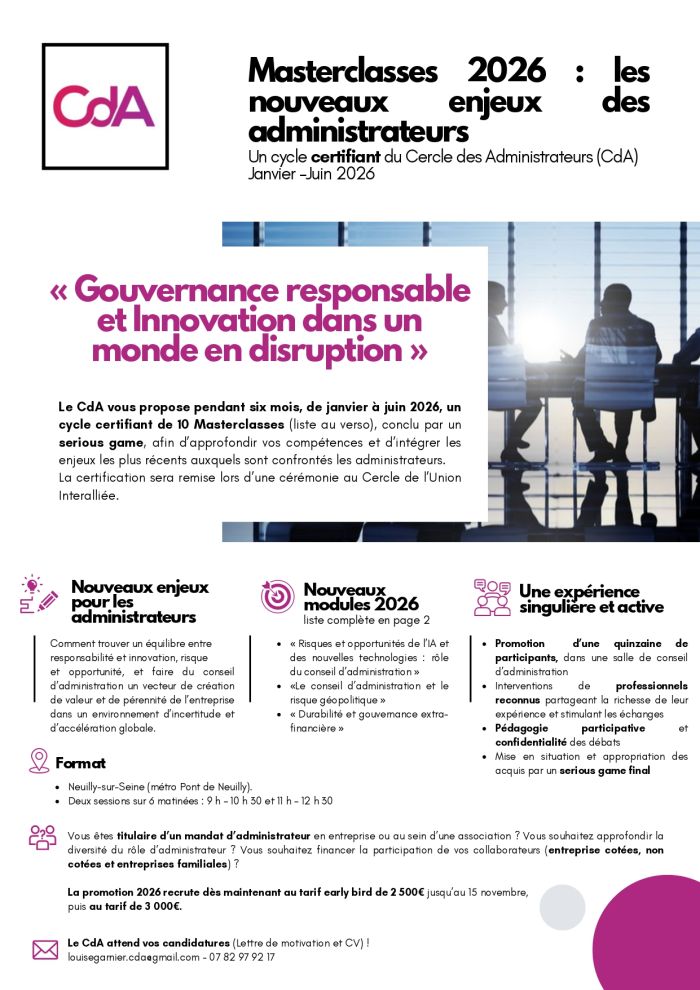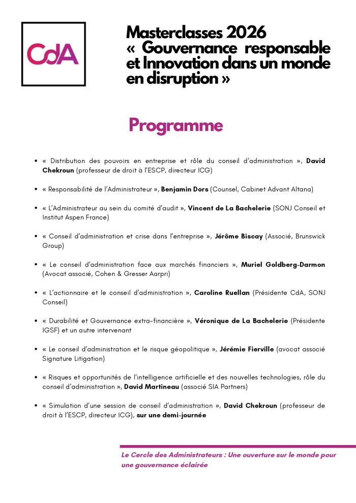 Caroline Ruellan, présidente du Cercle des Administrateurs, a le plaisir de vous annoncer le lancement d'un nouveau cycle de Masterclasses